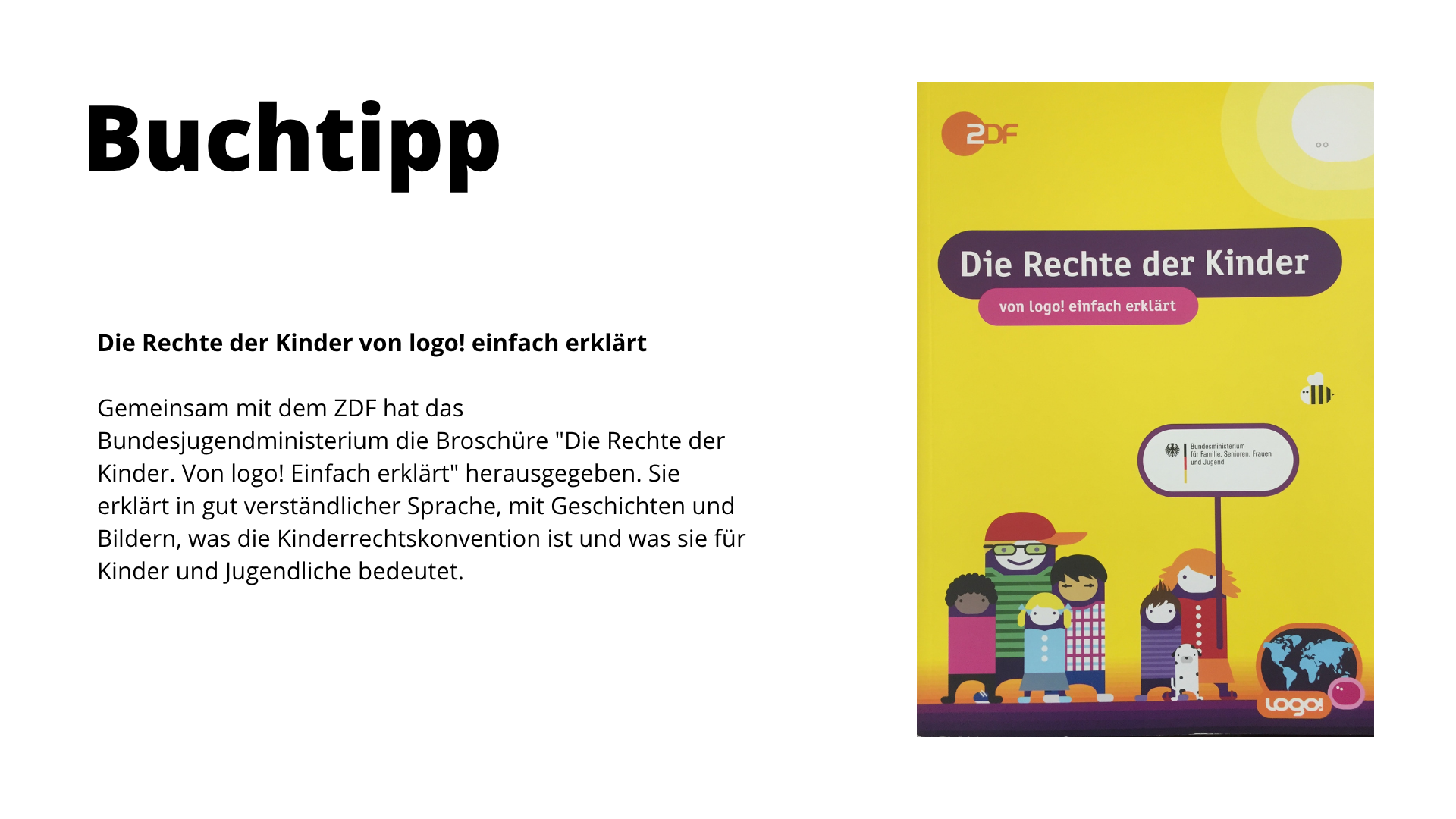 Gemeinsam mit dem ZDF hat das Bundesjugendministerium die Broschüre "Die Rechte der Kinder. Von logo! Einfach erklärt" herausgegeben. Sie erklärt in gut verständlicher Sprache, mit Geschichten und Bildern, was die Kinderrechtskonvention ist und was sie für Kinder und Jugendliche bedeutet.